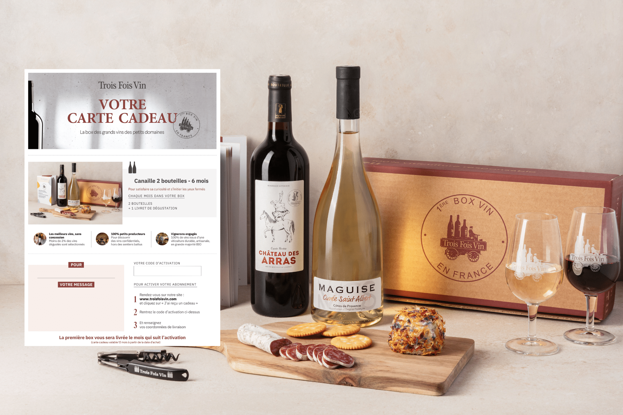 La gamme de box Trois Fois Vin se compose de 3 abonnements vin au choix. Tout d’abord la box Canaille, composée de 2 ou 3 bouteilles par mois, est idéale pour les amateurs de vin qui souhaitent s’initier sans risquer de se tromper ou pour des aperos et des repas entre amis. Puis, la box Signature, composé de deux ou trois vins haut de gamme, elle offre, chaque mois, une dégustation des meilleurs vins, sur une sélection de cuvées remarquables et confidentielles, parfois issues d’appellations prestigieuses. Enfin, l’Intégrale, la box prestige, regroupe les 6 bouteilles de la sélection de vin du mois. C’est l’abonnement idéal pour un passionné qui ne veut rien manquer des découvertes offertes chaque mois par Trois Fois Vin et ne pas passer à côté de véritables pépites des plus belles régions viticoles !
