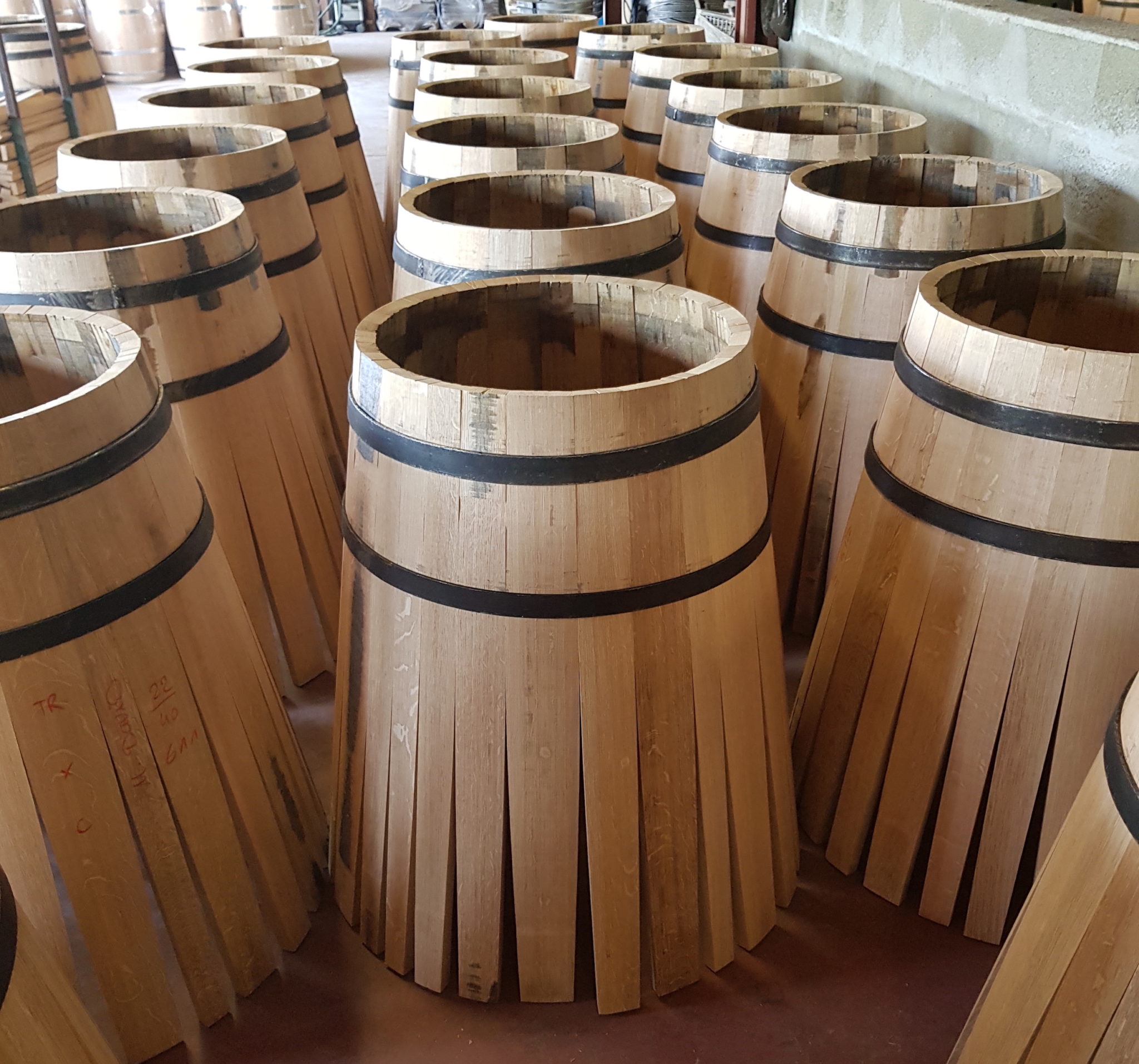 Après un séchage du bois qui dure plusieurs années et qui permet d’effacer la majorité des tannins, le tonnelier taille le bois en plusieurs planches. Une fois façonnées, cellles-ci deviendront des douelles. Elles sont ensuite assemblées autour d’un cercle métallique provisoire puis chauffées une première fois. Cele donne de la souplesse au bois et crée l’arrondi du tonneau.